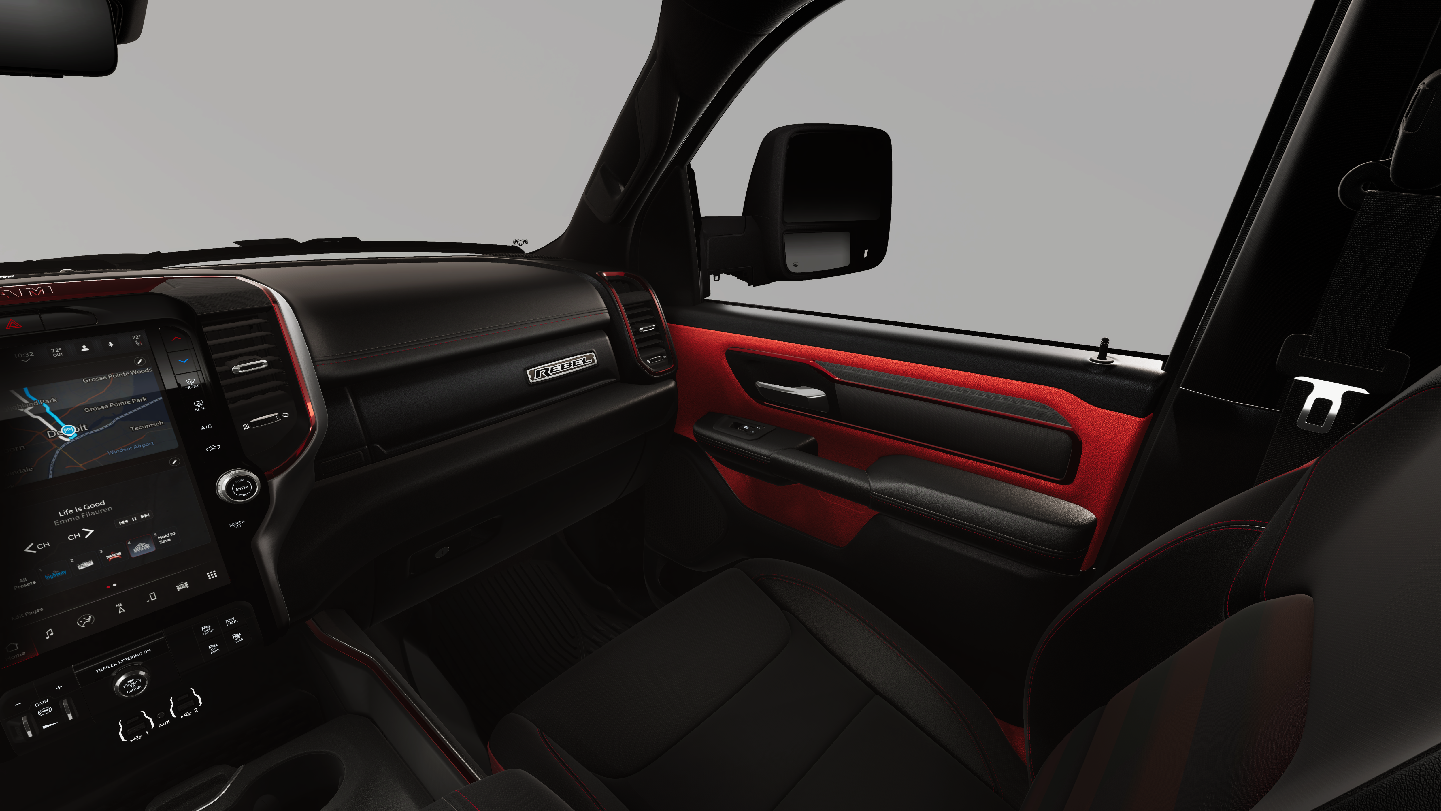 REBEL LEVEL 1 EQUIPMENT GROUP Rear Window Defroster, Wireless Charging Pad, Power Adjustable Pedals, Exterior Mirrors w/Supplemental Signals, Exterior Mirrors Courtesy Lamps, Auto Power-Folding Mirrors, Remote Tailgate Release, Auto Dim Exterior Driver Mirror, Black Premium Power Mirrors, TRANSMISSION: 8-SPEED AUTOMATIC (8HP75) (STD), ENGINE: 3.0L I6 HURRICANE SO TWIN TURBO ESS (STD). Ram Rebel with Canyon Lake exterior and Red/Black interior features a Straight 6 Cylinder Engine with 420 HP at 5200 RPM*.