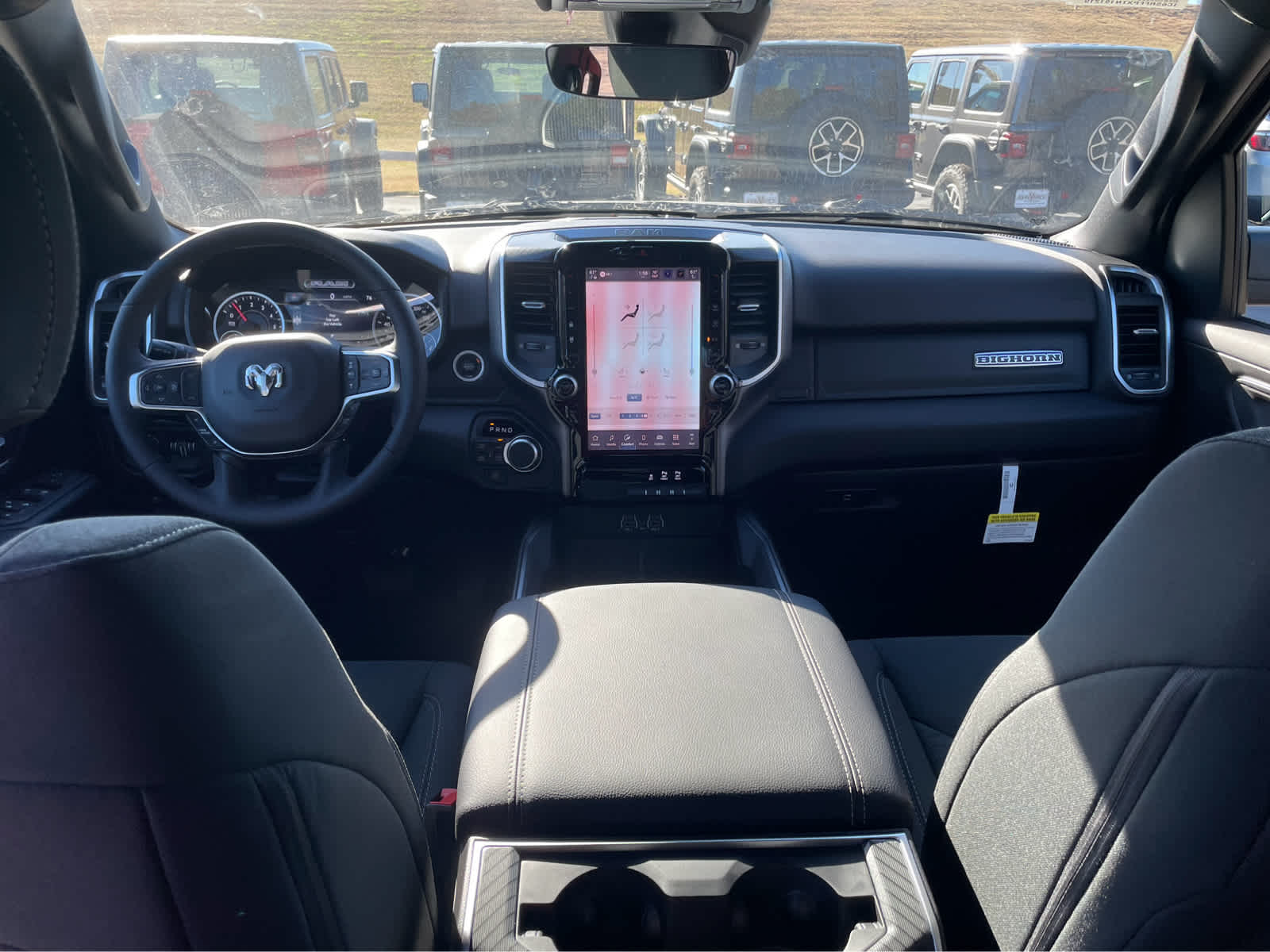 SiriusXM Radio Service, Power Adjustable Pedals, Leather Wrapped Steering Wheel, 12 Touchscreen Display, Glove Box Lamp, Auto Power-Folding Mirrors, 115V Auxiliary Rear Power Outlet, Media Hub w/2 Charge Only USBs, Heated Front Seats, Security Alarm, Black Premium Power Mirrors, Premium Overhead Console, 9 Amplified Speakers w/Subwoofer, Disassociated Touchscreen Display, Body Color Fender Flares, Remote Tailgate Release, 115V Auxiliary Power Outlet, LED Dome Lamp w/On/Off Switch, Universal Garage Door Opener, 2nd Row In Floor Storage Bins, Sun Visors w/Illuminated Vanity Mirrors, LED Footwell Lighting, Rear Window Defroster, Rear View Auto Dim Mirror, Rear Power Sliding Window, GPS Navigation, Overhead LED Lamps, Wheels: 20 x 9 Aluminum Chrome Clad (WRK), Tires: 275/55R20 OWL All, Aux Battery, 700 Amp Maintenance Free Battery, Active Noise Control System, GVWR: 7,100 lbs, 3.55 Rear Axle Ratio, Dual Rear Exhaust w/Bright Tips, Start-Stop Dual Battery System, 230 Amp Alternator, Tires: 275/55R20 OWL All Season, Bridgestone Brand Tires, Accent Color Premium Power Mirrors, Exterior Mirrors w/Supplemental Signals, Black Headlamp Bezels, Exterior Mirrors Courtesy Lamps, Grille Black Surround Black Mesh, Auto Power-Folding Mirrors, Wheels: 20 x 9.0 Aluminum Painted Clad, Auto Dim Exterior Driver Mirror, Black Exterior Truck Badging, Anti-Spin Differential Rear Axle, Accent Color Door Handles, Accent Color Tailgate Handle, Black Interior Accents, Dual Exhaust w/Black Tips, Body Color Front Bumper, Body Color Rear Bumper w/Step Pads, Black Tail Lamp Bezels, RAM Grille Badge - Black, Black Painted Exterior Mirrors Caps, MOPAR FRONT & REAR RUBBER FLOOR MATS, TRANSMISSION: 8-SPEED AUTOMATIC (8HP75). Ram Big Horn with Diamond Black Crystal Pearlcoat exterior and Black interior features a Straight 6 Cylinder Engine with 305 HP at 6400 RPM*.