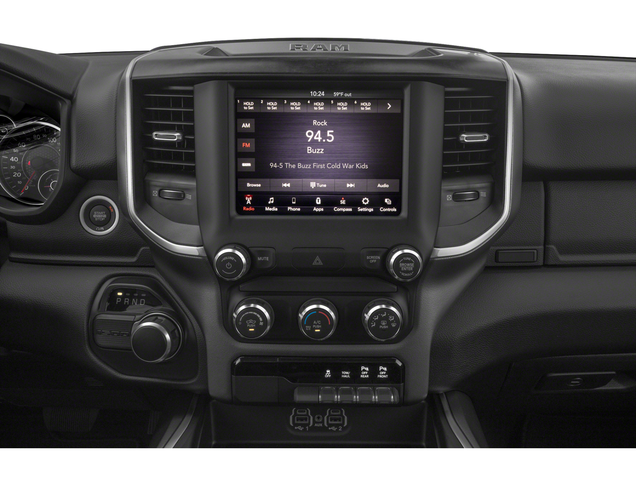 BIG HORN LEVEL 2 EQUIPMENT GROUP SiriusXM Radio Service, Rear Window Defroster, ParkSense Front/Rear Park Assist w/Stop, Rear View Auto Dim Mirror, Power Adjustable Pedals, For More Info, Call 800-643-2112, Rear Power Sliding Window, Rear Dome w/On/Off Switch Lamp, Glove Box Lamp, Power 4-Way Driver Lumbar Adjust, 115V Auxiliary Rear Power Outlet, Media Hub w/2 Charge Only USBs, Power 8-Way Driver Seat, Auto Dim Exterior Driver Mirror, Heated Front Seats, Heated Steering Wheel, Foam Bottle Insert (Door Trim Panel), Class IV Receiver Hitch, Security Alarm, Black Premium Power Mirrors, Big Horn IP Badge, Remote Start System, SiriusXM Satellite Radio, Exterior Mirrors w/Supplemental Signals, Exterior Mirrors Courtesy Lamps, Air Conditioning ATC w/Dual Zone Control, 115V Auxiliary Power, ENGINE: 5.7L V8 HEMI MDS VVT ETORQUE Active Noise Control System, Heavy Duty Engine Cooling, GVWR: 7,100 lbs, Dual Rear Exhaust w/Bright Tips, HEMI Badge, 23 Gallon Fuel Tank, 18 Aluminum Spare Wheel, NIGHT EDITION Tires: 275/55R20 OWL All Season, Accent Color Premium Power Mirrors, Exterior Mirrors w/Supplemental Signals, Black Headlamp Bezels, Exterior Mirrors Courtesy Lamps, Auto Dim Exterior Driver Mirror, Black Exterior Truck Badging, Anti-Spin Differential Rear Axle, Wheels: 20 x 9.0 Premium Paint/Polished, Exterior Mirrors w/Memory, Black Interior Accents, Dual Exhaust w/Black Tips, Power-Folding Mirrors, Body Color Front Bumper, Body Color Rear Bumper w/Step Pads, Black Painted Exterior Mirrors Caps, REMOTE START SYSTEM, TRANSMISSION: 8-SPEED AUTOMATIC (8HP75), BLACK, DELUXE CLOTH BUCKET SEATS Power 8-Way Driver Seat, Center Console Parts Module, Bucket Seats, Manual Adjust 4-Way Front Passenger Seat, Full Length Floor Console, Power 4-Way Driver Lumbar Adjust, RADIO: UCONNECT 4 W/8.4 DISPLAY.